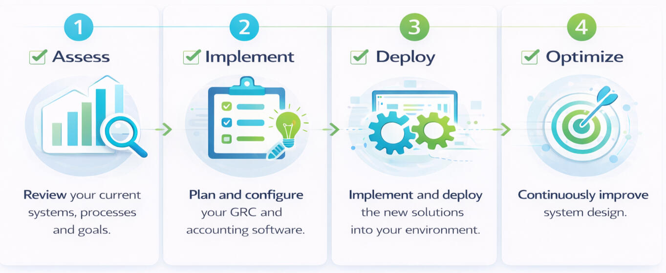 We help organizations design, implement, integrate, and optimize software ecosystems that support governance, risk, compliance, and financial operations.
